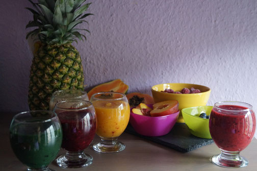 Passend zum Thema hat Kimberly diese Woche ein Rezept für einen Früchte-Smoothie kreiert, das ich abwandeln wollte. Da ich mich nicht entscheiden konnte, habe ich einfach verschiedene Smoothies ausprobiert. Dabei sind 5 Smoothies entstanden, in unterschiedlichsten Farben und Geschmäckern, von süß bis säuerlich. Erfrischend sind sie alle und damit genau das Richtige für diese Jahreszeit. Ich hab auch versucht, die Rezepte einfach zu halten. Vielleicht inspirieren sie euch, selbst welche auszuprobieren mit den Früchten, die ihr in der Küche oder im Garten habt.
